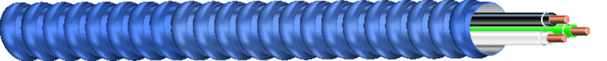 Southwire Blue Steel Armor Type MC Cable is constructed with soft-drawn copper, Type THHN/THWN conductors rated 90°C dry available in sizes 14 AWG through 2 AWG, and a green insulated grounding conductor. The conductors are cabled together and a binder tape bearing the print legend is wrapped around the assembly. Blue steel interlocking armor is applied over the assembly.