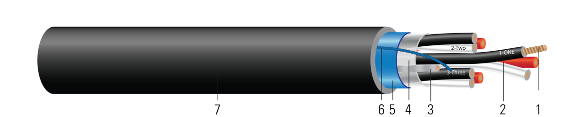 Southwire’s Instrumentation Cables Type TC-ER per UL 1277 are suitable for installations as outlined in NEC Article 336 for process control and instrumentation, control circuits for operation and interconnection of protective and signaling devices and for general use in manufacturing, industrial and commercial distribution systems. Cables are constructed with 7-strand copper conductors insulated with nylon covered PVC. The triad conductors are colored black, white, red and alpha-numeric printed. The overall assembly is covered with an aluminum polyester foil with 100% coverage and a tinned drain wire. The cable is suited for use in cable trays, raceways, conduit, aerial (when supported with a messenger) and direct burial. The cable is rated for -25°C to 90°C and rated for Class I Div II hazardous locations, sun and oil resistant. The jacket is black PVC with a nylon ripcord for easy removal.